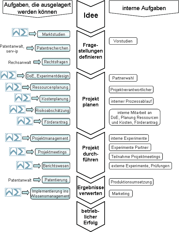 | Viele Aufgaben des F&E-Managements können im Betrieb oft nicht mit der erforderlichen Professionalität durchgeführt werden. Externe sachkundige Unterstützung von geübten F&E-Managern führt nicht nur rascher und sicherer zum Ziel, sondern ist auch kostengünstiger. | |||